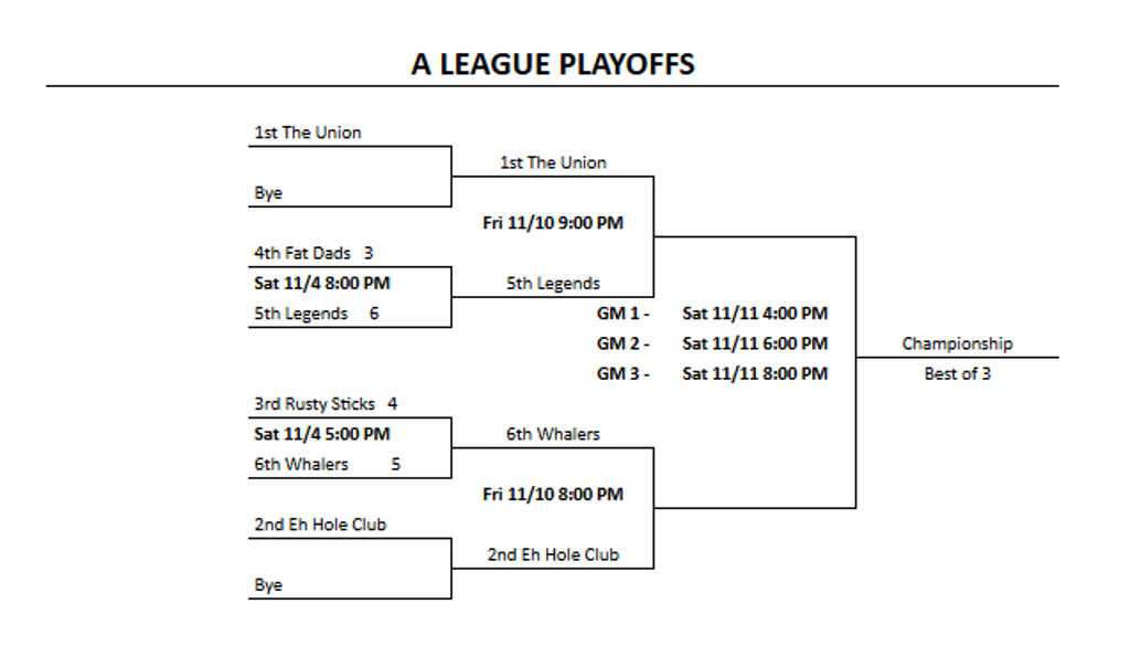 All playoff series are one game elimination, adult finals are now a best of three series, youth are best of 1.